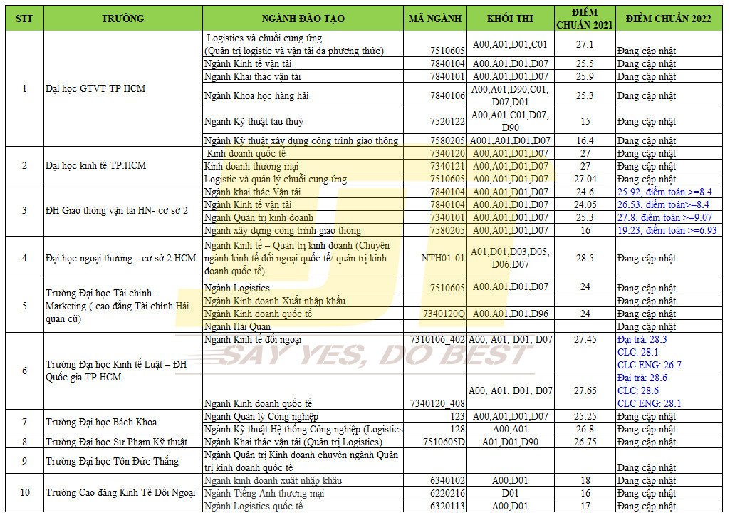 *** BẢNG TỔNG HỢP ĐIỂM CHUẨN ĐIỂM CHUẨN NGÀNH LOGISTICS NĂM 2022 TẠI HCM.